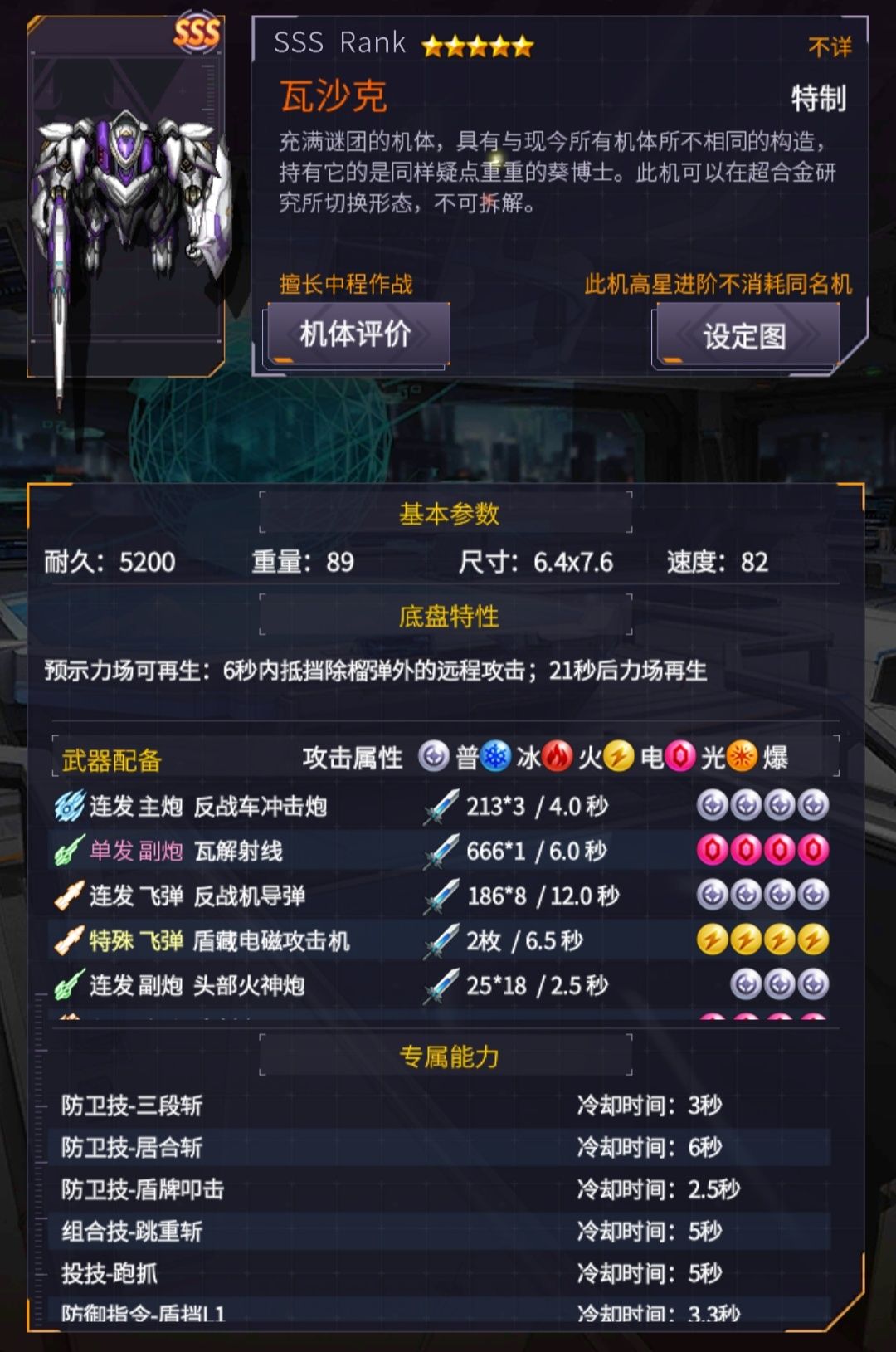 首先那就是我们系统送的的瓦沙克了。瓦沙克是游戏少有的不需要同名机就能二改的S机,也是几乎所有新人前期的实力支柱。而且瓦沙克多样的武器系统也能应对各种局面,后来也能改造成各种形态来弥补各位阵容的漏洞。但是正所谓万金油,所以前期适当培养一下就足够了,强化到5星足够形成战斗力。省下的核心可以用来培养其它机子。