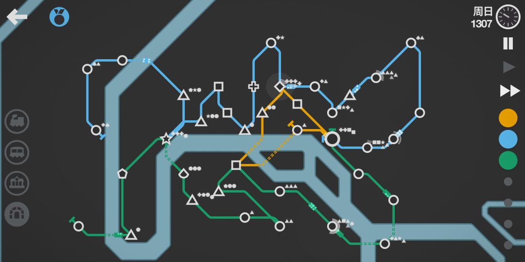 长铁路右边都是圆,客流压力很大,所以要经常把东边的车瞬移过来分担压力,用了这个技巧,过1300压力不大