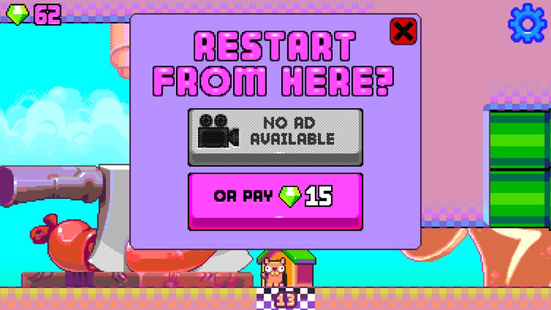 游戏的电子音乐让人有种回到过去的感觉 ,想起小时候玩过的《超级玛丽》。游戏中有很多小房子,一定要停在房子附近才能存档,存档的时候会跳出选项的,钻石或者看广告存档就可以,关闭网络食用效果更佳哦~也不用每一关都存档的,看个人需求,经常存档还是很贵的。广告也是会看没的。
