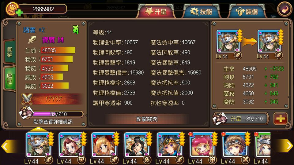 1.基础三围:顾名思义,生命物攻魔攻物防魔防需要注意自己的英雄是主要打哪些方面的输出,从而决定自己的武器用什么类型的属性。比如在七天活动中,赠送的紫色武器就是一把魔攻输出武器适合赵云这样大招打魔攻输出的宝宝。根据我们攻略组的测试,游戏的伤害数值大约等于我方宝宝的攻击力,减去对方宝宝相应的防御力。哪怕攻击力低于对方的防御力也会造成伤害,但数值几乎可以忽略不计。就如下图,我方诸葛亮物理防御在2700左右,敌方周仓的物理输出攻击力在6300左右。周仓的普通攻击,大约造成诸葛亮3400-3500的伤害。