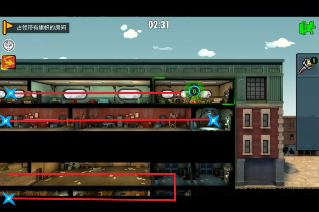 开局开完一组怪,下电梯作怪,坐第一个跳跃点到中层,再左走坐第二个跳跃点登顶,最好向右一直走到底即可。