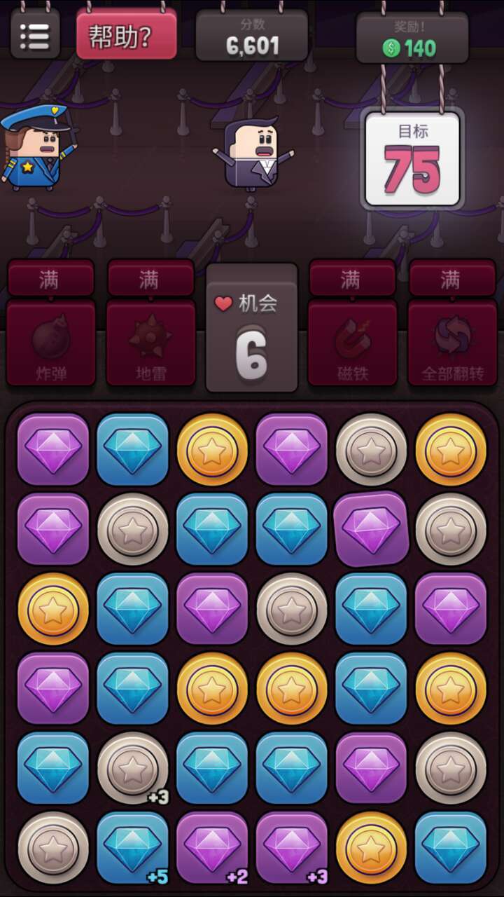 把金币和钻石翻成和周围的一样就可消除,可多个一起消,道具也很实用,很特别的消除游戏。