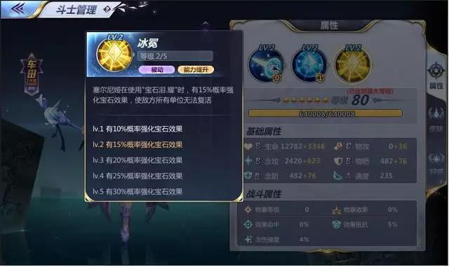 ▲塞尔尼娅使用“宝石泪·耀”时,有15%(满级30%)概率强化宝石效果,使敌方单位所使用单位无法复活。