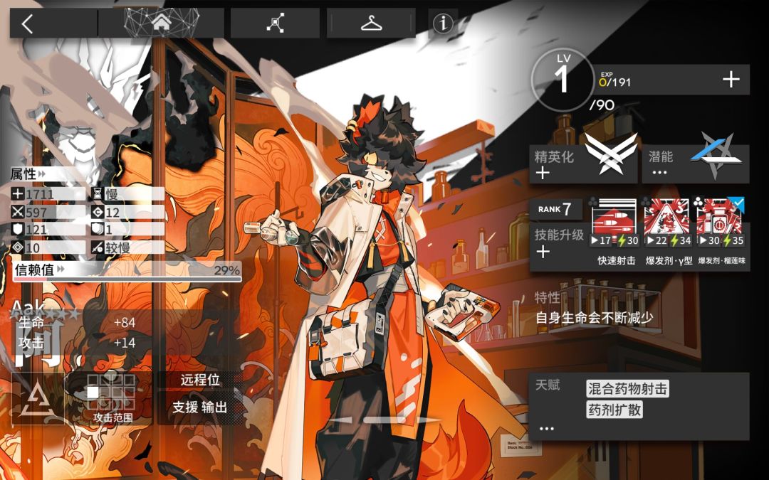 第一天赋(混合药物射击):阿每次攻击敌方目标时会随机触发下列效果之一:回复自身的15%生命值;当次攻击的攻击力提升至150%;使目标停顿1.4秒;使目标眩晕1秒。