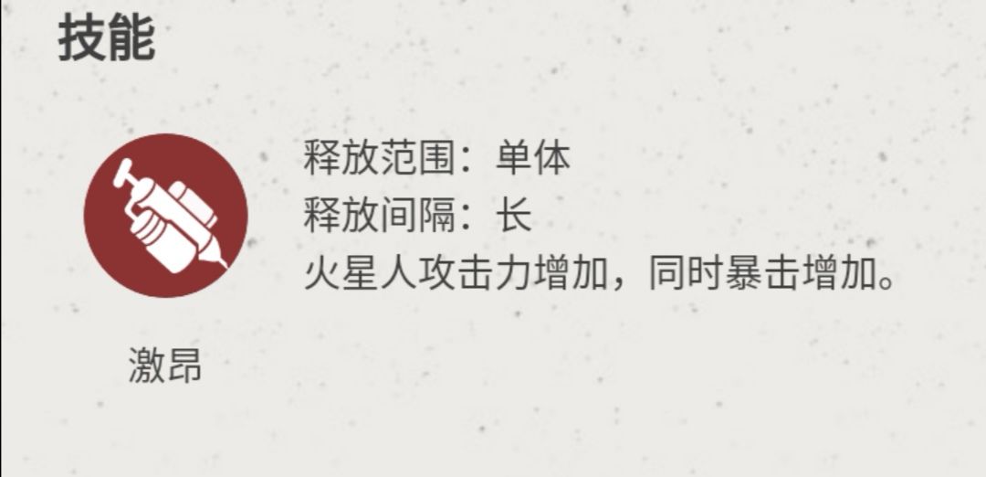 外星人大招是激昂(磕药),在长时间内提高自己的攻击力和暴击,这也是外星人平A打出更高输出的主要来源,等到后期五星的外星人一枪打后排大概能打出4万的伤害,打前排也能有一两万