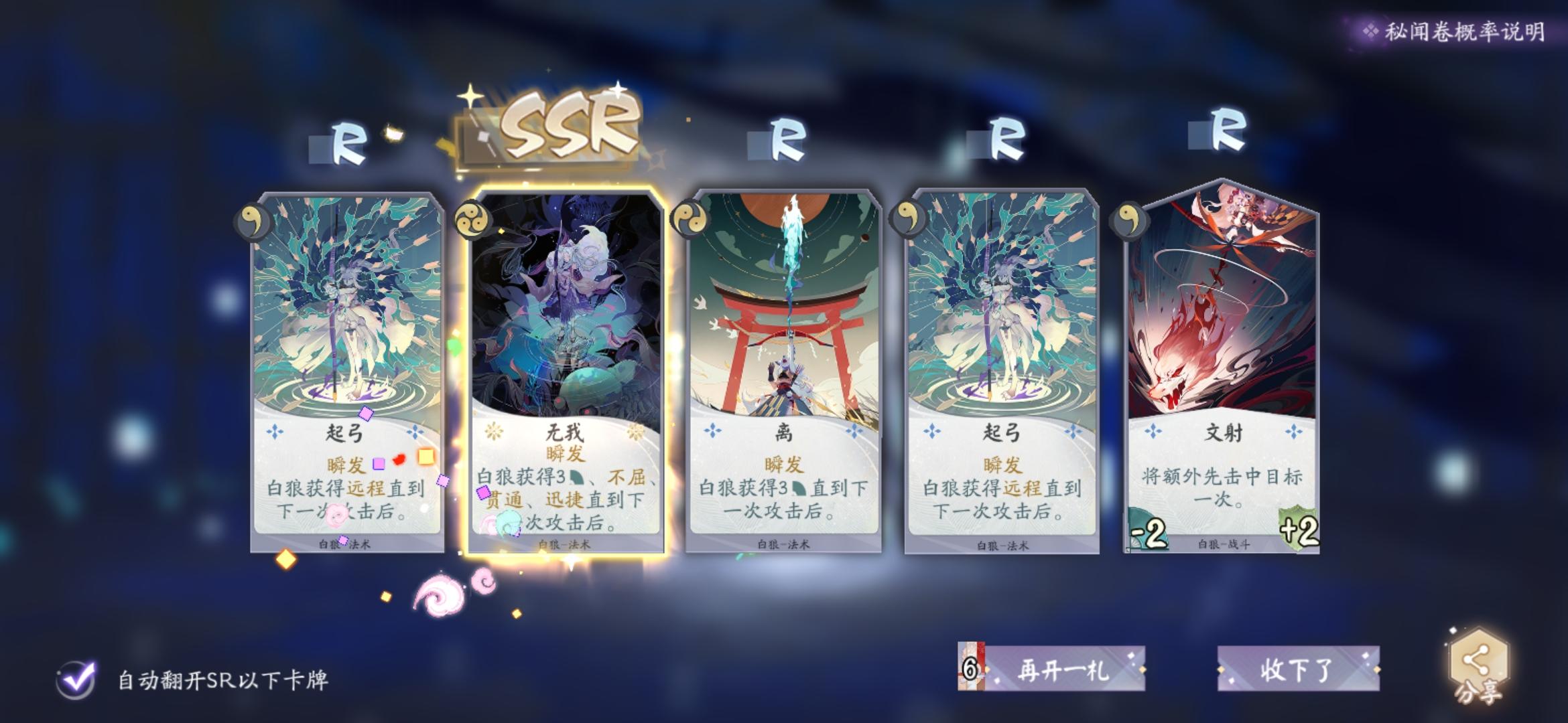 76包四张ssr,另外登陆送了张无我,硬生生凑齐了白狼唯二的ssr卡。