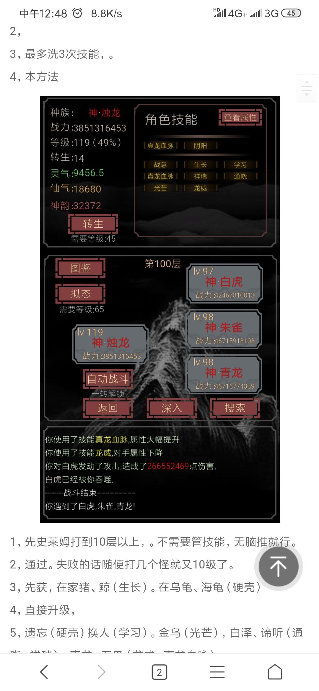 其他都是虚的,尖甲+九命+涅槃,就可以打败孙悟空了,剩下的就是如何让你在小怪手上活下来,我选择的是全闪避流,高飞+光芒+扶摇直上+飞行。再来两个核心技能学习和变化。剩下的就是个人兴趣了,什么河蟹啊,通晓啊,人言啊,魅惑啊,这样的。九命~九命猫,涅槃~凤凰,闪避技能好像是金翅大鹏~扶摇直上,高飞~鸿鹄,飞行,光芒~金乌。核心技能:人族~学习,灵明石猴~变化。河蟹两个技能都叫河蟹都蛮厉害的,六耳猕猴~通晓,九尾妖狐~魅惑。PS,神兽线我打过,我用的烛龙,最后打到哪吒怎么打都打不过去,可能是我脸黑,我烛龙那时候带的是双真龙血脉,阴阳,学习,通晓,变化,龙威,战意,光芒,九命。打哪吒打不过,那哪吒边上的小怪还有中等概率死,最后没办法转生的。打史莱姆也只是挂机挂久了,发现等级还挺高,技能还可以,干脆就打了下去,最后居然通关了。烛龙我没打过去,给你们攻略看看你们能不能用烛龙打过去,顺便附上我史莱姆通关图,尖甲反伤秒boss,让boss知道什么叫我杀我自己。哈哈哈哈哈哈哈