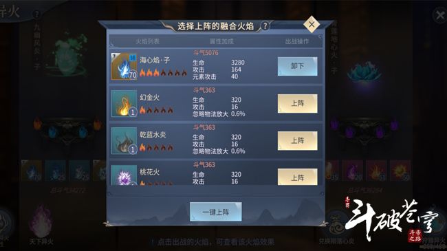 并且处于助阵的异火是不会提供原有的异火属性的。例如海心焰·子原本提供的属性为体魄、攻击、命中和抗暴击值,但处于上阵状态下时提供的是生命、攻击和元素攻击者三种属性。化生火与兽火则是提供生命、攻击和忽略物法放大这三种属性,在等级相同的情况下,等阶越高,所增加的属性值就越高。