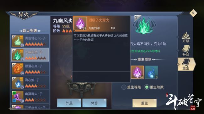 在本次的版本更新中,新增了一个功能——异火重生阶数时,显示可获得道具数量。该功能上线后,斗者们在选择重生异火等阶时就可以清楚的看到可以获得的子火源火数量,将异火的利用率最大化。