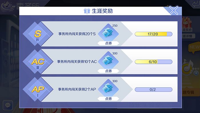 最后玩家通过事务所挑战,不仅可以获得服饰奖励,另外还可以完成生涯奖励。玩家达成S评价、AC评价、AP评价后,就可以积累生涯奖励任务,当达到任务要求后就可以获得大量的点券奖励。