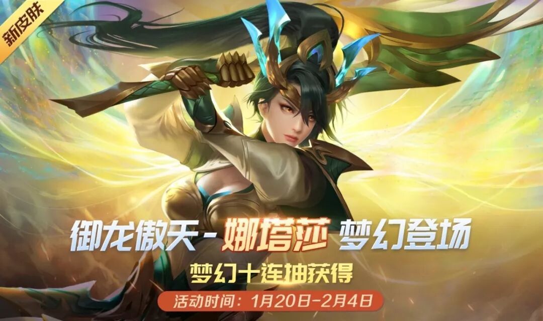 2. 梦幻碎片兑换: 1月20日-2月11日,使用梦幻碎片可兑换全新梦幻皮肤御龙傲天-娜塔莎和全传说全梦幻皮肤,还有盖世英雄天秤座-凌。