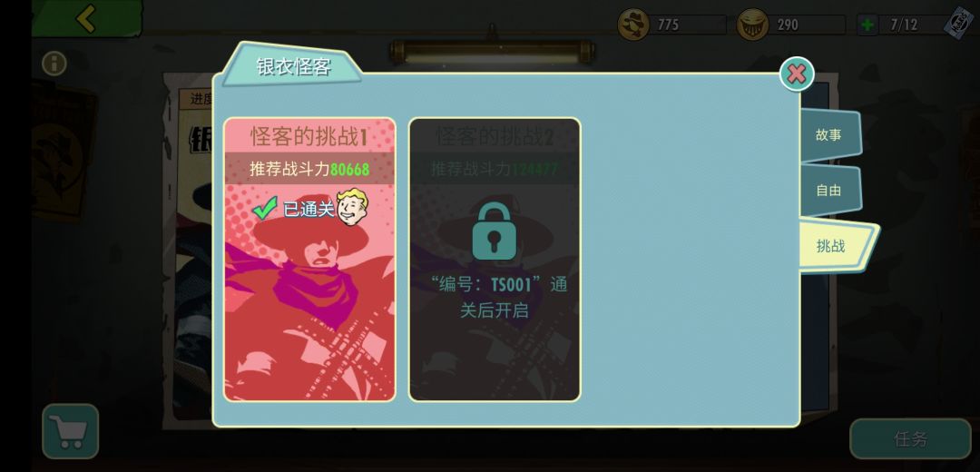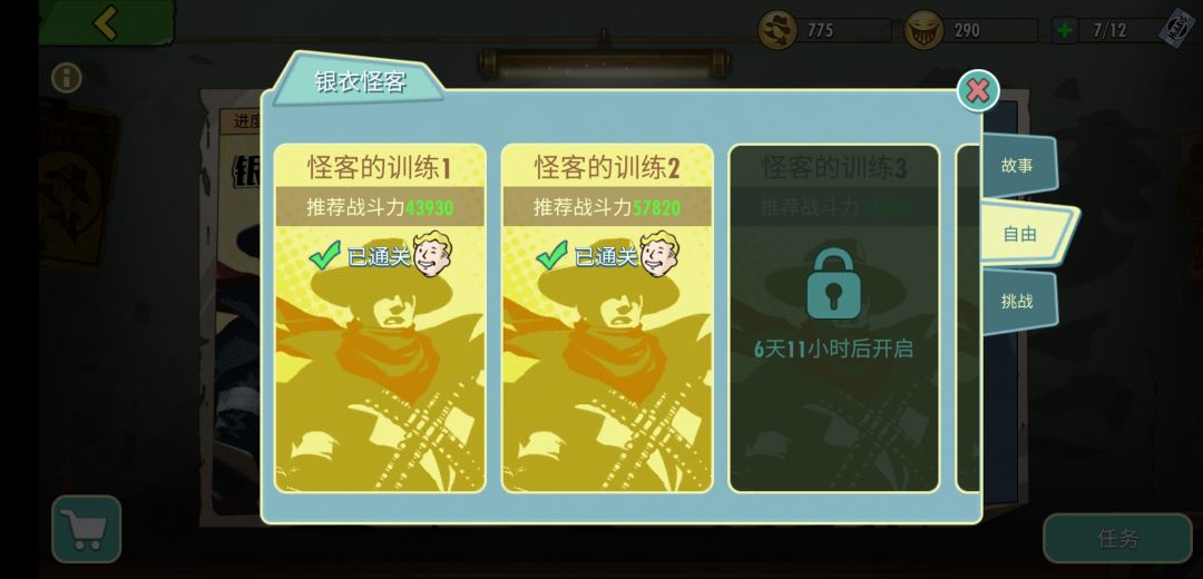 不同于主线任务,银衣怪客支线有故事、自由、挑战三种模式,目前故事模式只开放“银衣怪客现身”关卡,第二关的关卡也是要等6天后开放。自由模式开放2个,挑战模式开放1个,挑战模式只有当两个自由模式均通关之后才会开放。