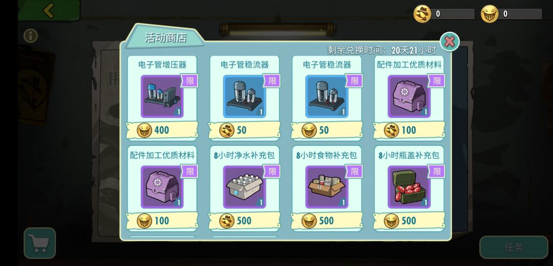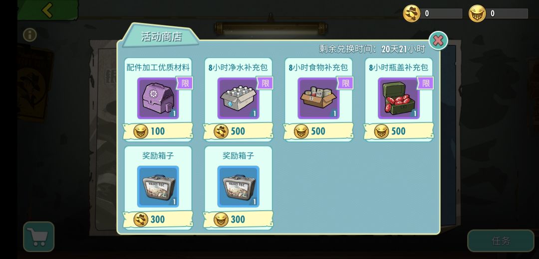 8.净水、食物、瓶盖8小时包1个,每种限量5个,每个500金币。