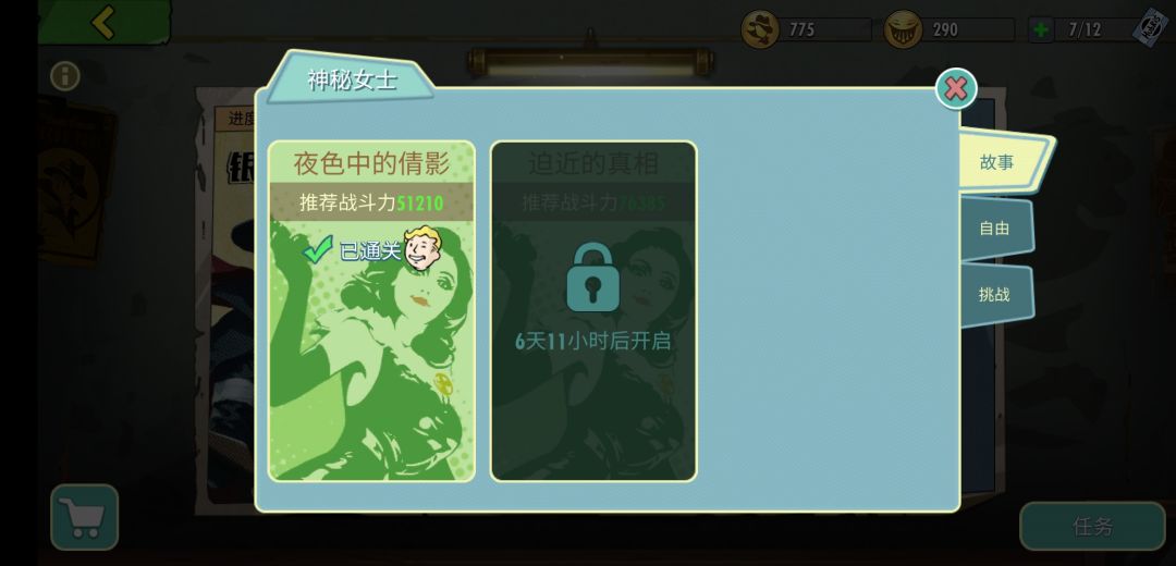 同样,神秘女士的支线中也只开放一个故事模式关卡“夜色中的倩影”,2个自由模式,1个挑战模式。