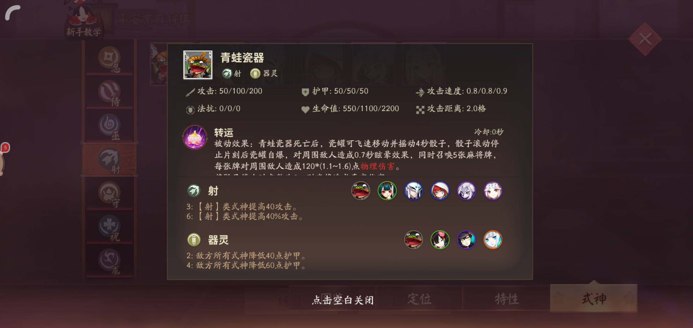 身材40/600,白卡里较下等身材。但技能是罕见的治疗,推荐放在副t位置让大部分友方血量都有减少再开出鲤鱼旗治疗。6祝羁绊算强但祝类单卡本身效果一般般,暂时也没想到好的搭配,神明效果对于巫类很强,但由于巫类自带一个神明荒,只需要二神明时通常的外挂选择会是辉夜姬。属于前期(打野和少人口时)乏力,中期可以,后期没羁绊难以上场的局面,故给三星