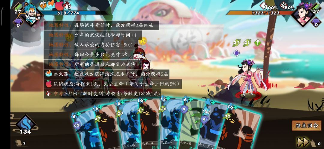 如图,地图自带词条冰冻2,冰火莲4层,所以最终冰冻层数=2×2+4×4=20,灼烧层数=2+2×4=10