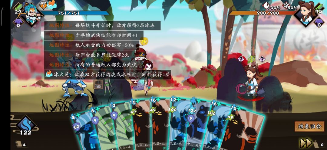 如图,地图自带词条冰冻2,冰火莲5层,所以最终冰冻层数=2×2+4×5=24,灼烧层数=2+2×5=12