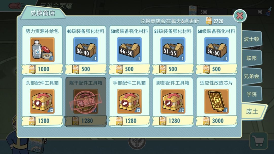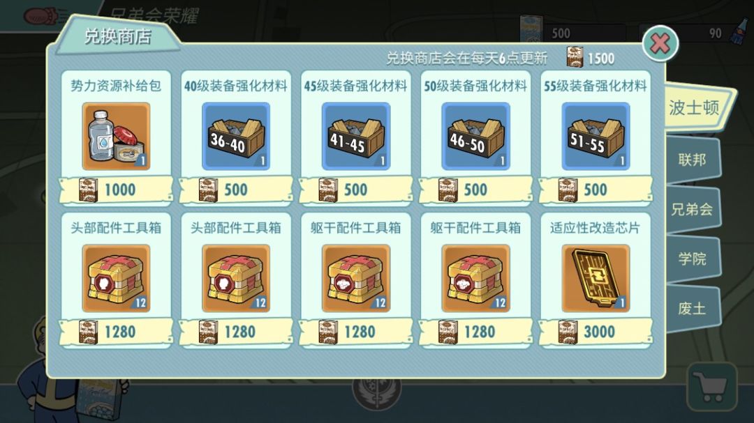 波士顿商店可以买到40级到55级装备材料,以及头部和腰部配件改造升级用的工具箱,和一个改造芯片。