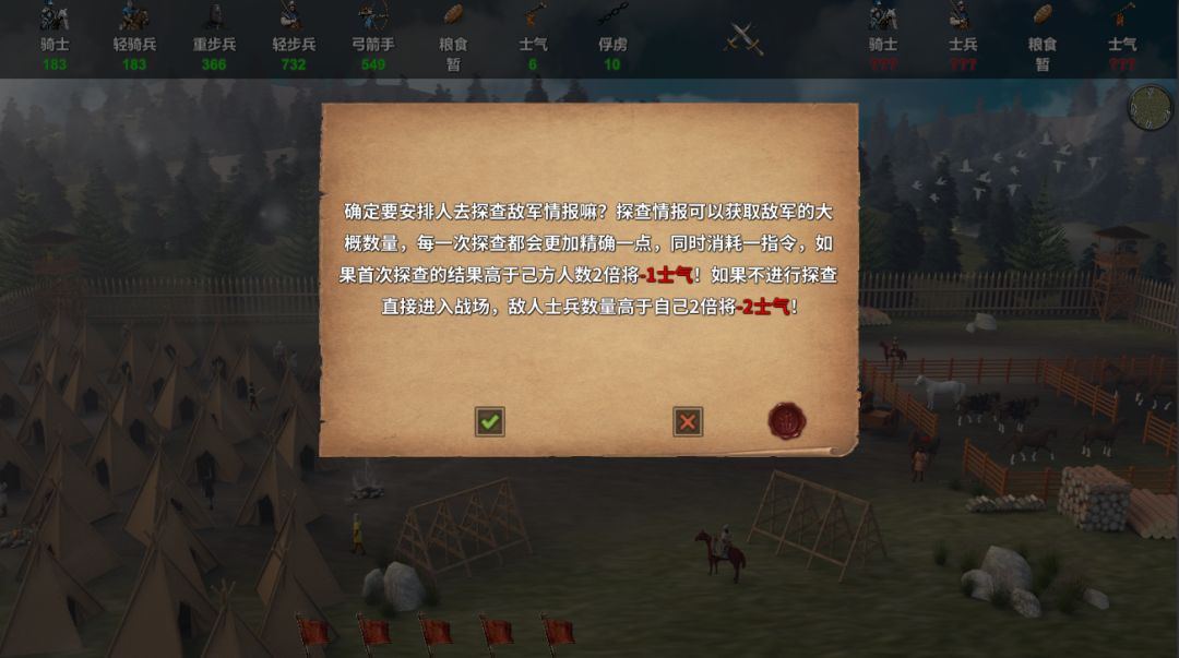 宣战之后玩家领兵,进入营地界面,将根据玩家的军事能力和国家情报获取指令数量。