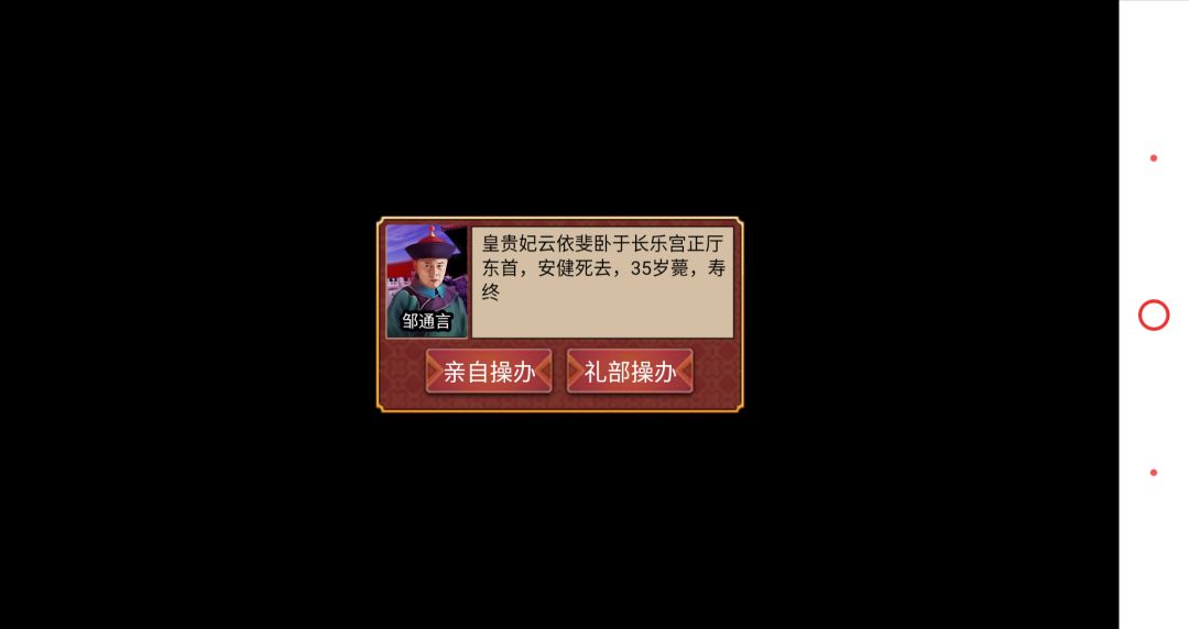 看起来是普通的卡机,实际上是朕突然想玩情深戏码却测试得出的一个bug。皇贵妃云氏寿命终了,朕提前服毒,与之殉情。结果当朕睡了一觉依然有关于爱妃去世的消息,这也就罢了或许朕还得料理掉这些乱七八糟的事情才能去死呢,但是,这时候,就开始卡机黑屏了。而且这个先后顺序也有毛病啊……