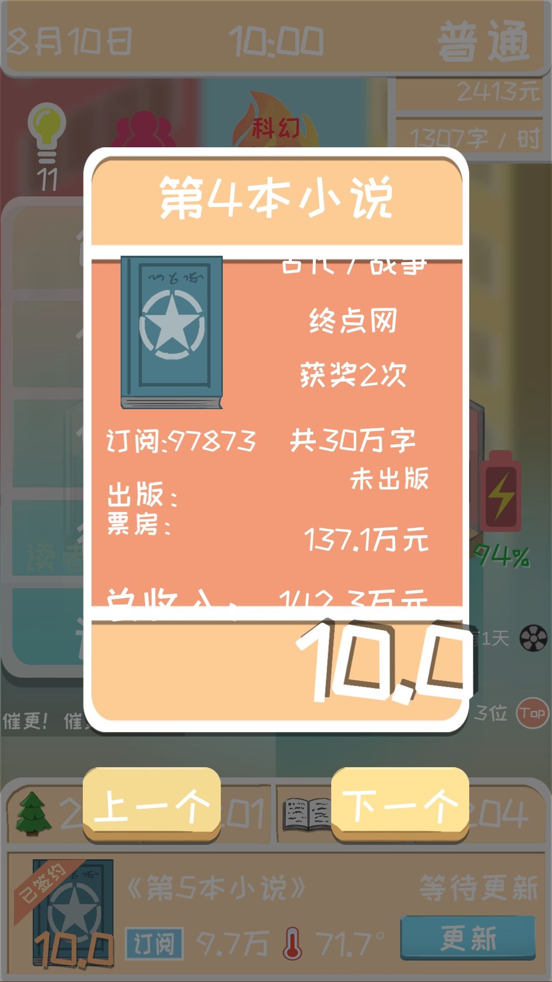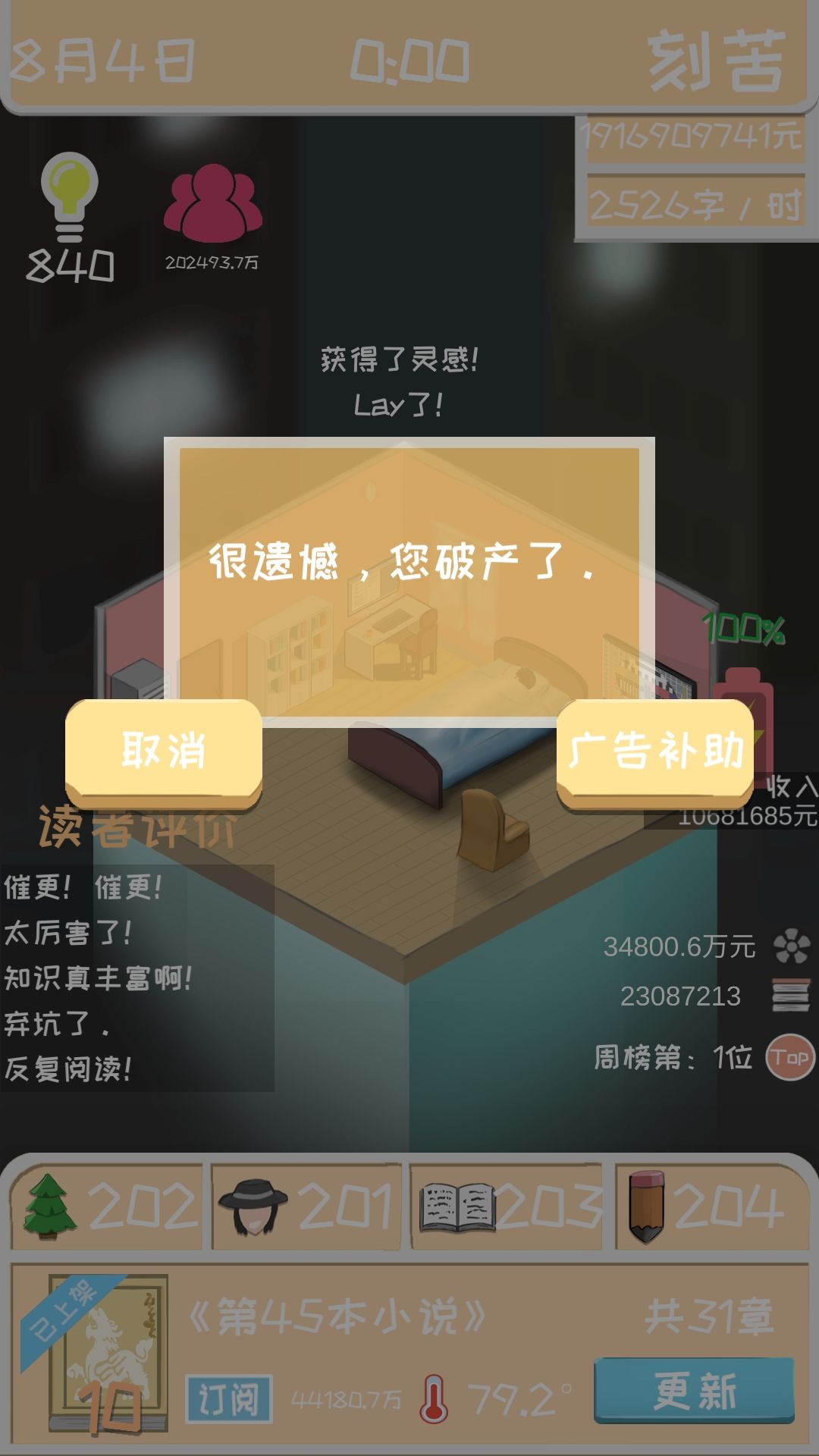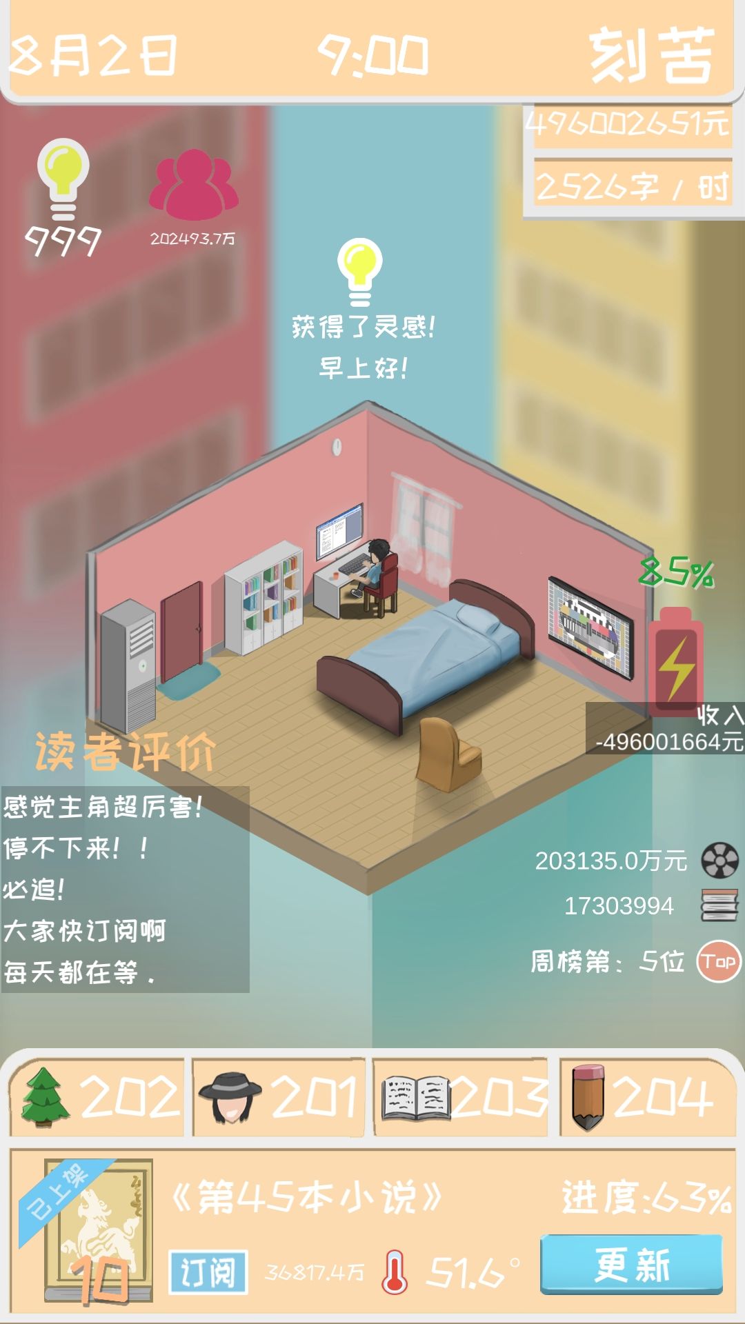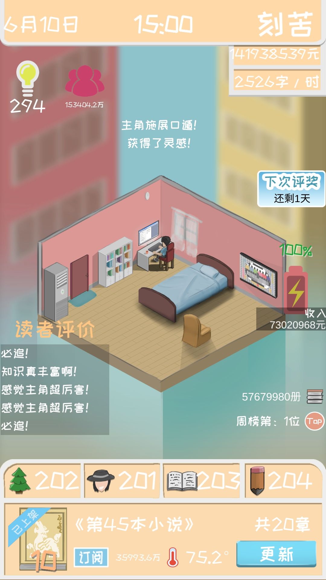 接下来说一下这么多粉丝是怎么弄的。当你找到一个最适合的创作搭配之后(比如我的是异世玄幻),三围也已经到了满值200,这时候你的作品第二章之后评分就是10分了,这时候,你只需要直接把书完结掉,就可以获得百分比增长的粉丝和开下一本书时的订阅数。(也就是说粉丝和订阅是和完结书的本数成指数增长的)这样只需要一本书写3章,很快你就是世界偶像了(雾)。我是写到了第45本书。就已经有这个数据了,有兴趣的朋友可以试试粉丝和订阅是不是和钱一样有上限。