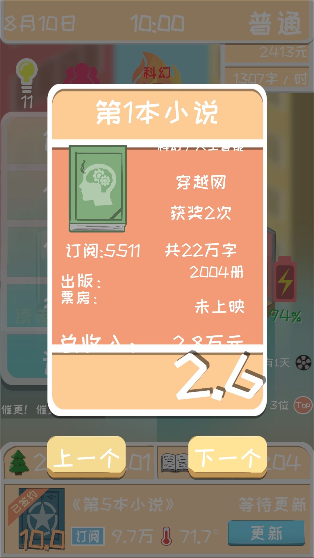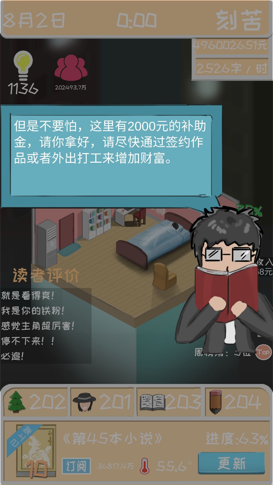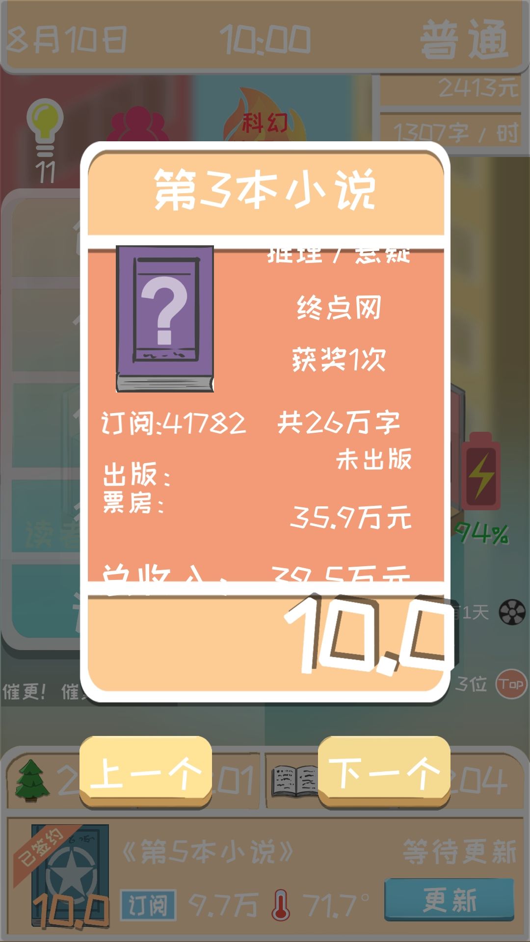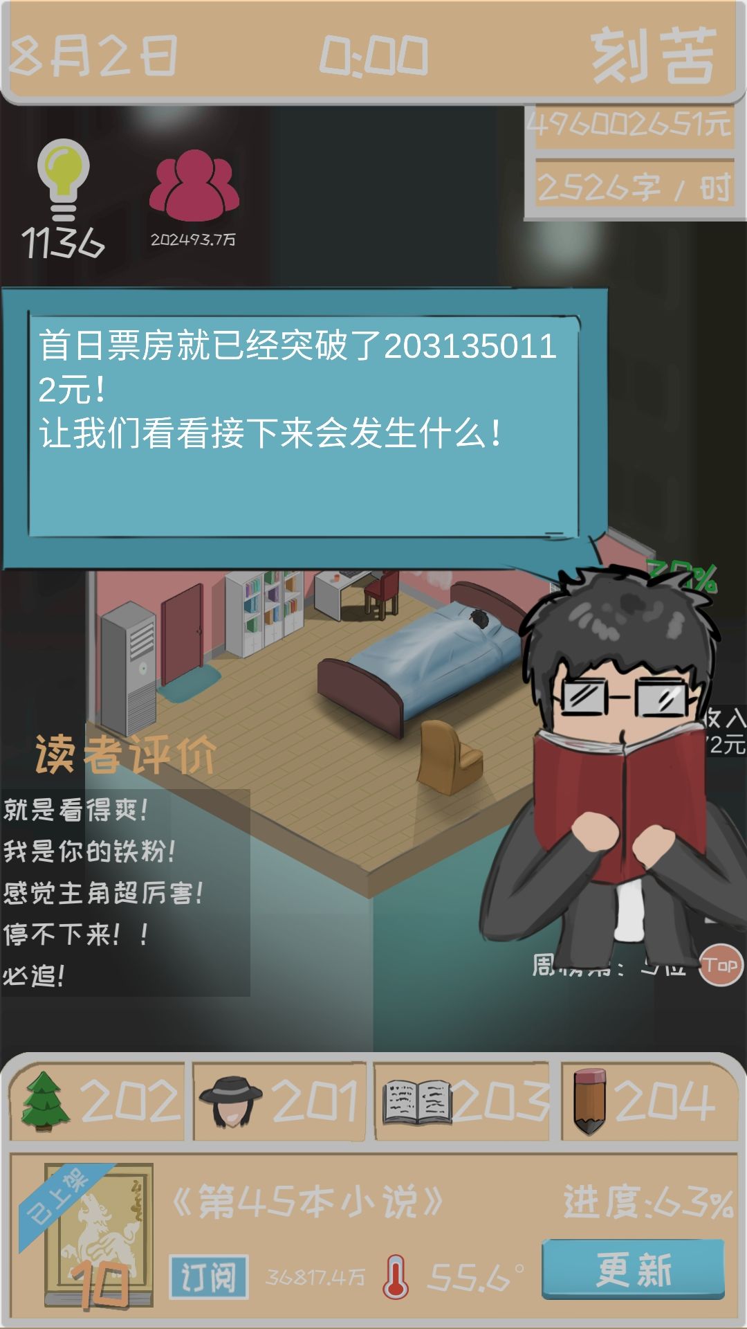 接下来说一下这么多粉丝是怎么弄的。当你找到一个最适合的创作搭配之后(比如我的是异世玄幻),三围也已经到了满值200,这时候你的作品第二章之后评分就是10分了,这时候,你只需要直接把书完结掉,就可以获得百分比增长的粉丝和开下一本书时的订阅数。(也就是说粉丝和订阅是和完结书的本数成指数增长的)这样只需要一本书写3章,很快你就是世界偶像了(雾)。我是写到了第45本书。就已经有这个数据了,有兴趣的朋友可以试试粉丝和订阅是不是和钱一样有上限。