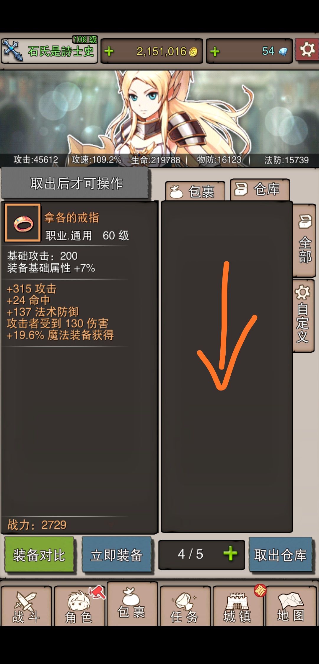 装备能放入仓库,但是只提示第一件。取出后提示下一件。