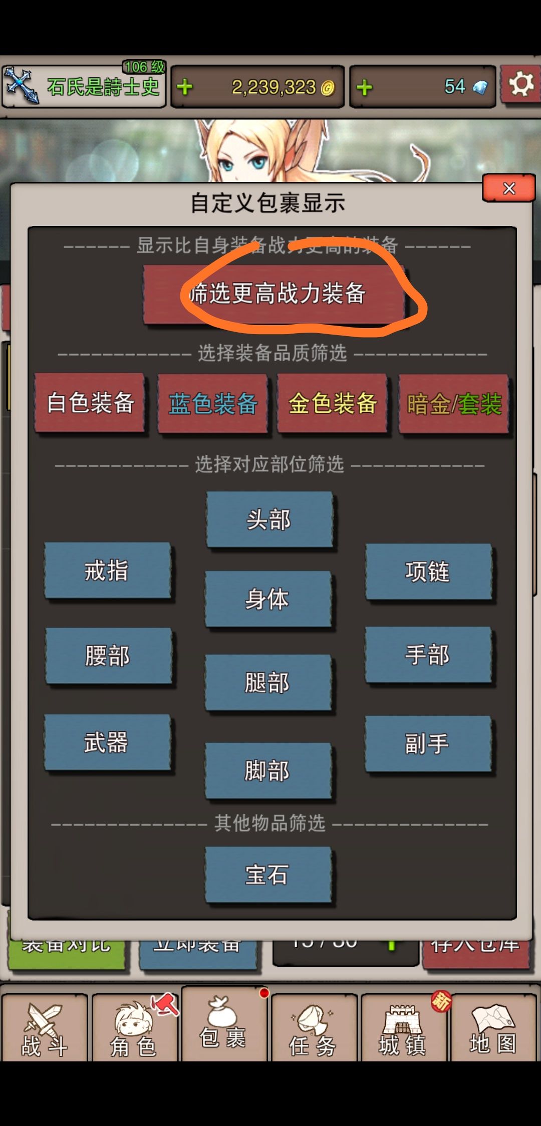 2.点击自定义,然后随便点一个。我一般是点筛选跟高装备。