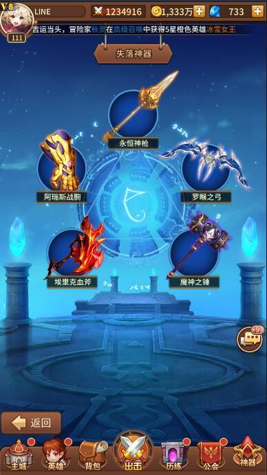 阵容均可佩戴一件神器,完成神器解锁条件就可解锁相应神器,每件神器根据技能等级均有不同的效果,可自我搭配阵容