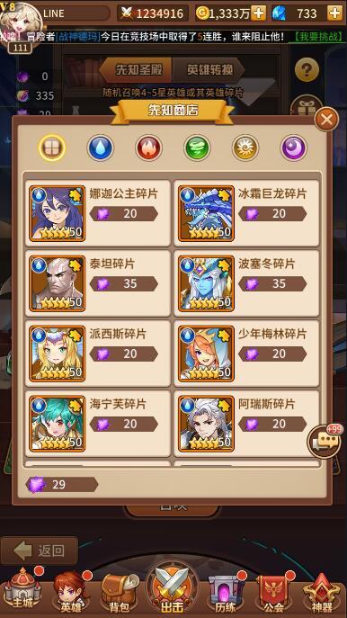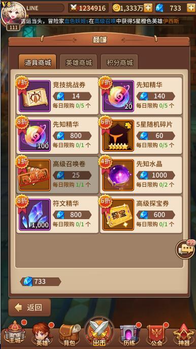 .经验副本:日常两次,缺英雄经验时可考虑钻石扫荡(平时多注意冒险商店,精灵商店里可用金币购买的英雄经验)