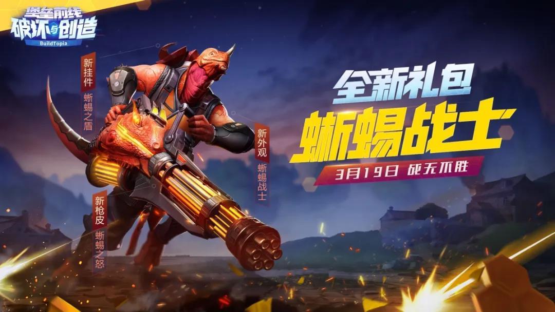 蜥蜴军团霸气来袭,【蜥蜴战士】礼包已于今日上线,购买即有几率获得加特林传说皮肤蜥蜴加特林,史诗品质外观蜥蜴战士,蜥蜴盾牌!史诗套装【蜥蜴战士】,让探险家成为蜥蜴军团中骁勇善战的一员,朋克造型外露不羁气场;史诗背部挂件【蜥蜴盾牌】,在蜥蜴先祖的庇护下,肆意驰骋在战场下;手持传说品质的【蜥蜴加特林】,喷射愤怒的火焰,做蜥蜴大军的开路先锋。现在加入蜥蜴军团!你是前锋,我是后卫,在堡垒的战场上组最天秀的队伍!