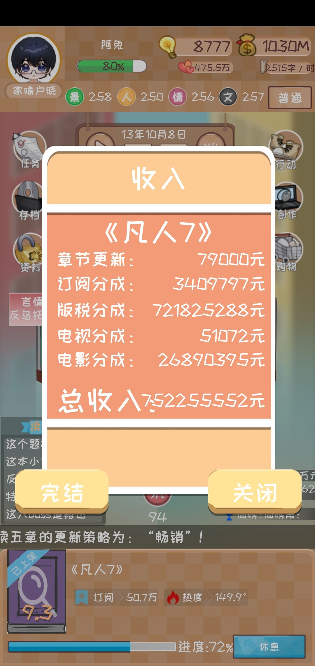 我个人认为游戏后期可以玩两种流派,金币流和章节流。金币流其实上面也提到了就是使用畅销策略,出版大量的书籍从而获取大量金币。而章节流就是追求更新更多的章节,到解锁9999灵感时,可以在拿到了电影的钱之后更改策略为低欲,使用低欲时需要注意,刚使用低欲它还是会显示正常需要的灵感,这时不要立即投入灵感,点取消再点一次更新,就会发现需要的灵感变少了,章节流需要耐心,我在上个版本最多更新过1010章,过程确实比较艰辛,但是不妨作为游戏的挑战尝试一下。下面附上我更新千章的图片。