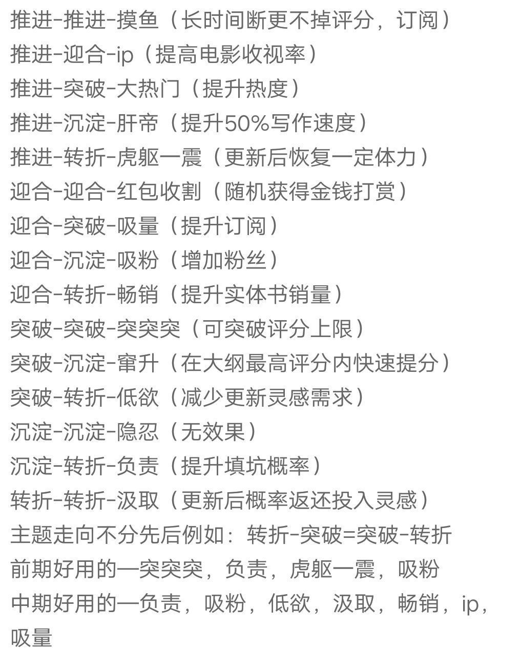 接下进入正题,我的玩法是开局不要使用金币,留着就用来付房租。先用玩手机积累灵感积累到999(过程有点艰辛,开四倍时间速度好点),搭配很好的题材开书,评分一般能达到7.0至8.0。所以开局推荐使用肝帝策略提高写作速度,投入灵感为积极。新版本可以用加减号,加到积极就可以了,然后评分提高的同时就可以签约、上架、出版。这时写一章就有几百块收入了。如果你发现你的评分停着不增加了,这时用突突突策略,第一个网站争取网走电视出现,钱拿够了,产生的坑就用负责策略收尾完结,得到第一笔金,可以用来升级四维和速度。第二个网站就可以拍电影了,电影来了之后可以用ip策略一直用到电影上映结束,这时会耗费大量的灵感,所以开局一定要积累到999灵感,你想得到更多的金币就要每天都更新章节触发ip策略。我前期是一本书一个网站,所以到第三本书时已经在第三个网站上登了,每次开局都积累999灵感再写书,保证写书时灵感充足,当然写书时可以交叉着用刷手机获取一点灵感,一直使用却不获取灵感,灵感肯定是不够用的。四维高了,评分也会相应的高,所以三月一次的评奖也能获取名次,然后就可以解锁灵感上限,同样把灵感刷满,有了更多的灵感就意味着能写更多的章节,等到使用了ip策略拿到了电影的钱时,这时就可以在每十章上架新书后一直使用畅销策略,你会发现你卖出了大量的书籍,注意一定要等出版社把剩下的版税发来了再更第十章,这样可以挣到大量的钱。下面附上策略搭配图,题材搭配图,以及使用了策略之后的效果图