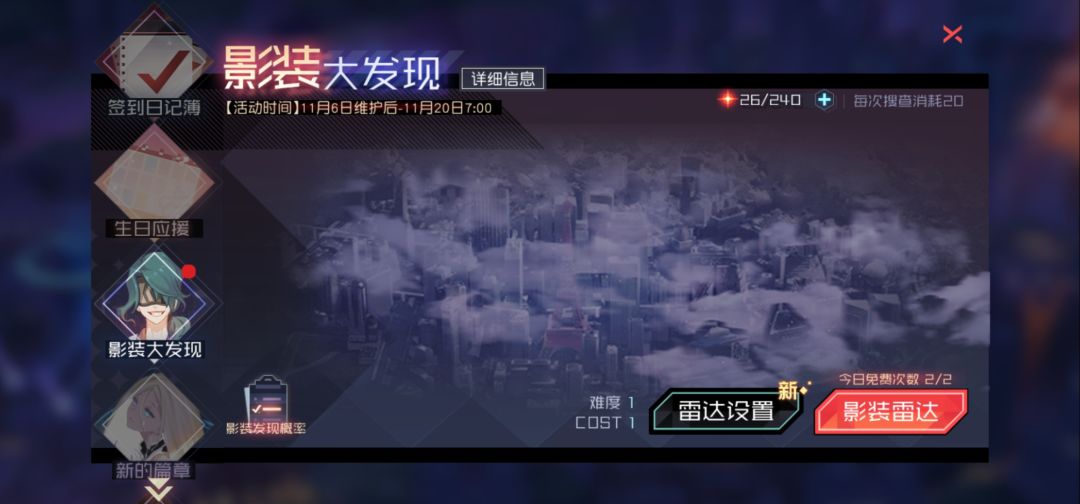 在活动中,指挥使大人可以设置影装雷达,选择不同Cost值和难度,搜寻对应的影装。不同难度对应的遗迹地图和影装刷新概率均有不同。