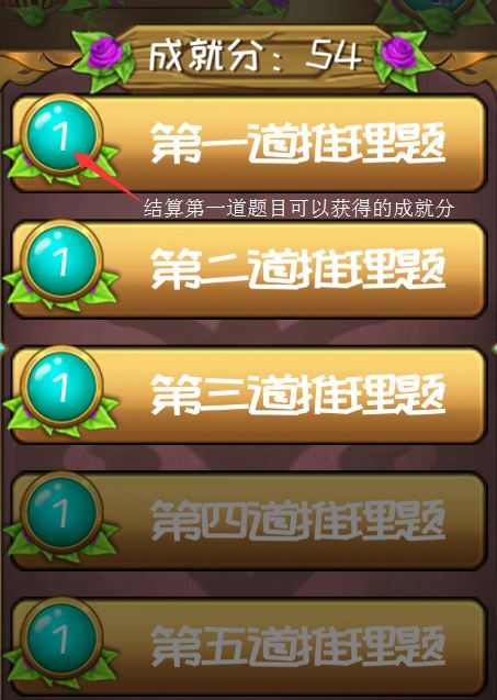 成就系统分两类:一种是题目解锁获得成就分,一种是等级达成获得成就分,每次完整答对所有题目后,系统会判断答对的题目是哪些,答对什么题型就可以获得什么题型的成就分。还有是等级打成解锁成就,答对一道题可以获得“初级推理师”称号,答对五道题可以获得“中级推理师”称号,答对九道题可以获得“高级推理师”称号,不同称号获得的成就分也不一样,具体可以在成就界面查看。