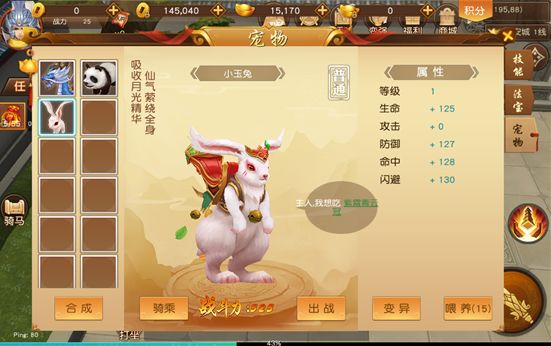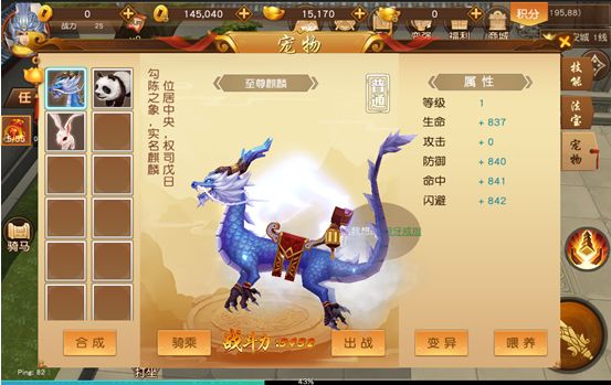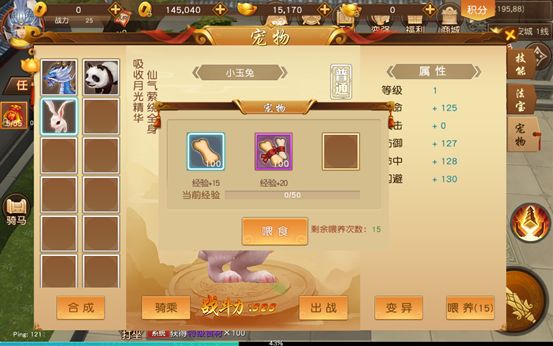 点击“喂养”按钮,可以给灵兽喂食,喂养可以提升灵兽的等级,灵兽升级后可提升灵兽的各种属性;需要注意的是,喂养灵兽爱吃的食材,或者是特殊的宠物食材,会更快的提升宠物的等级;