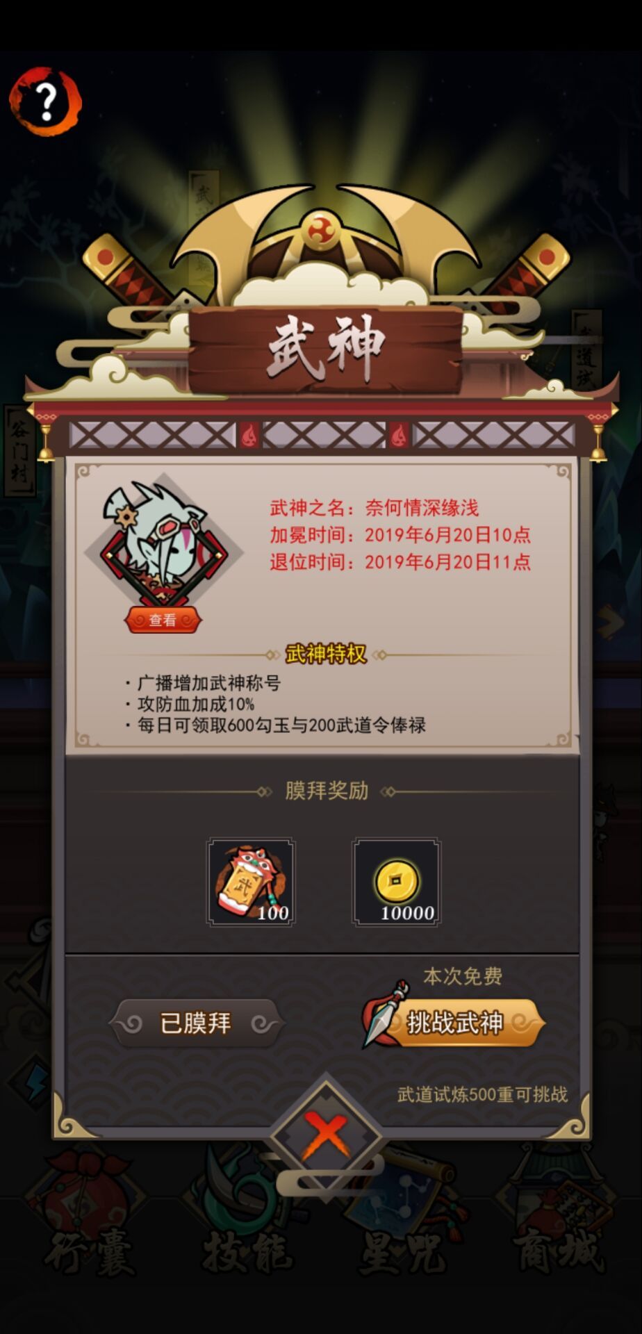 2 .武神生命 攻击 防御 加持百分十,并且每天可以摩拜一次,奖励一百武道令,一万金币,并且打败武神奖励200勾玉(一天一次),武神可以领取600勾玉 .两百武道令