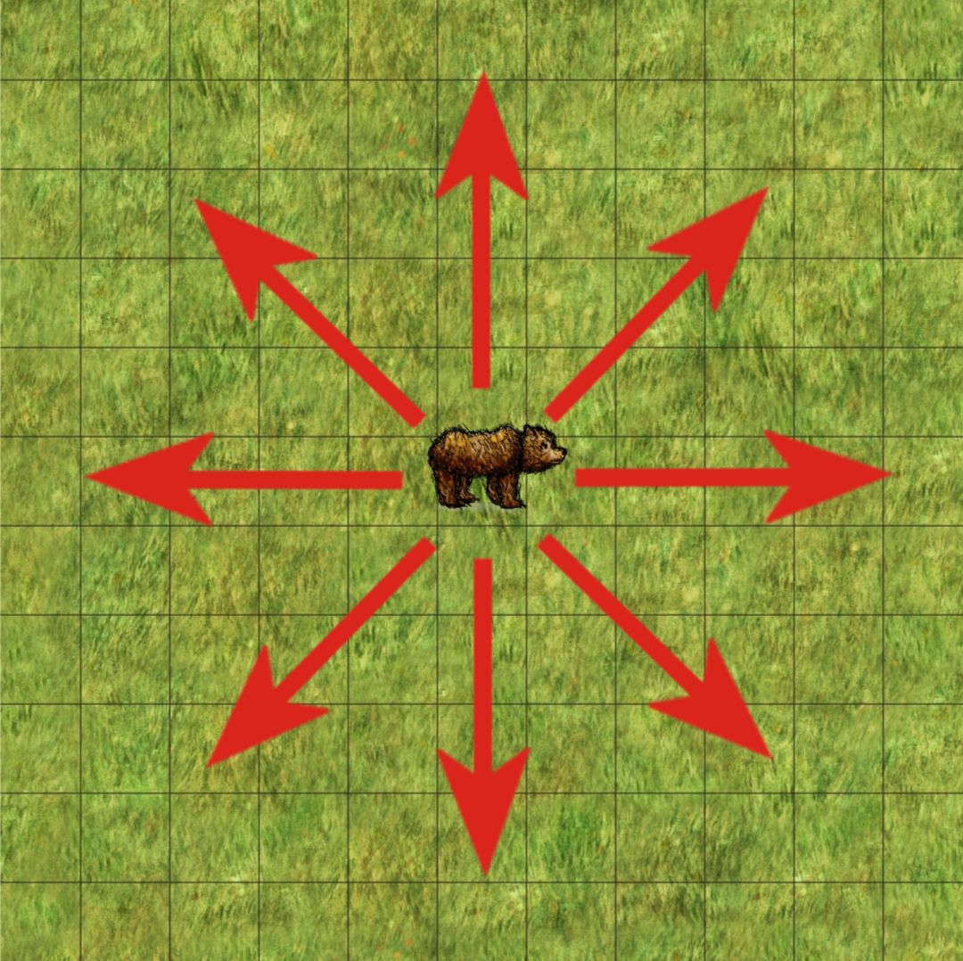 所以在没有物品可以站的情况下,不要正对着熊的这八个方向