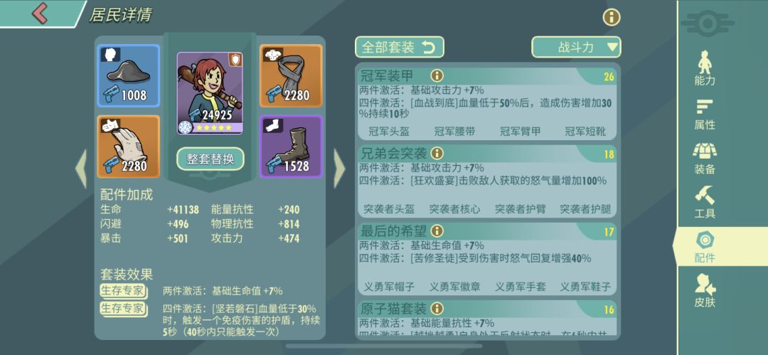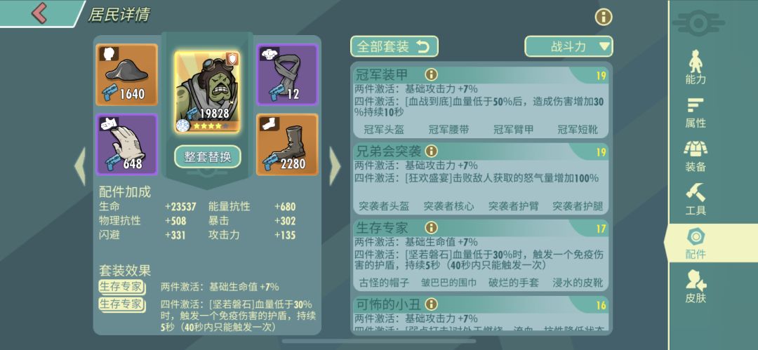 当然“生存专家”的优缺点也很明显,仅仅加血和坑性,无法加更多攻击力相关属性,要求穿戴的人必须是纯肉。基本也也只有前排可以带。
