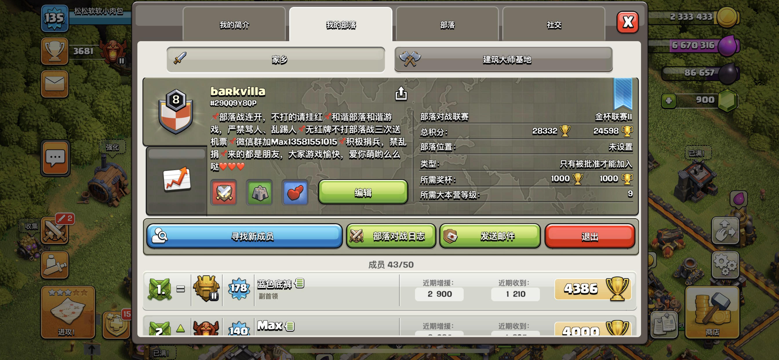 现招9本以上活跃长期稳定玩家,一起部落战一起联赛共同发展,来的都是朋友,有意向直接申请