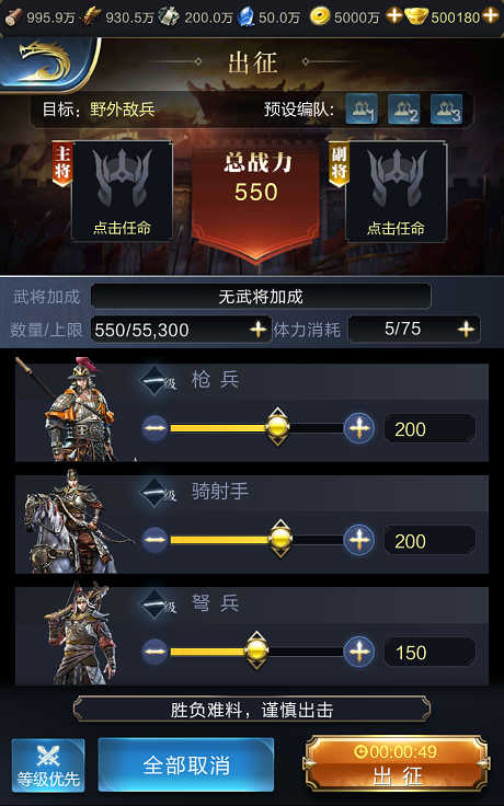 解析:四级野外敌兵对于枪兵有一定的克制效果,所以枪兵数量200就足够了,主要是多带点骑射手和弩兵。