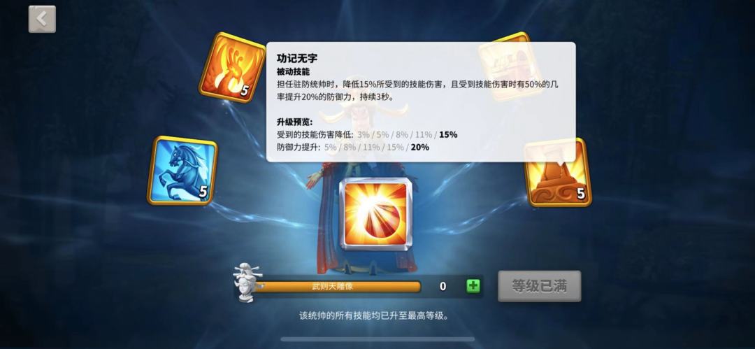 -技能优点-武则天的四号技能属于概率触发的一增益技能,降低部队受到技能伤害,同时获得一个技能触动触发的一防御增益,在受到伤害时概率触发提升防御属性,并且技能无内置冷却可以不断触发武则天技能提升防御,强化所率部队生存能力并同时影响所率部队受到伤害以及伤害减免最大收益效果