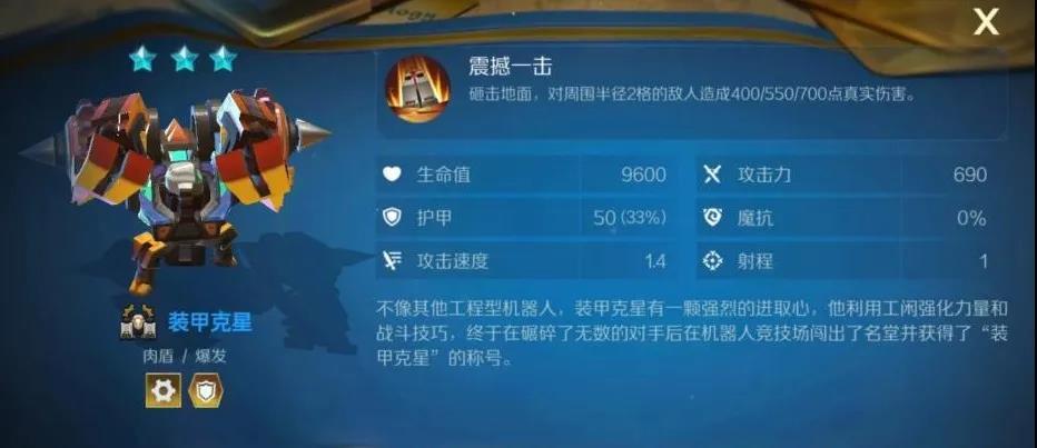 装甲克星本身拥有高额的护甲,并且技能可以造成范围真伤,面板一般,但是在对局中期还是完全撑得起场面的。追猎者S90可以作为中期的核心输出来培养,它的面板攻击力甚至高过一些传说级英雄,但相对的,它的护甲以及生命值都很低,注意保护好它哟