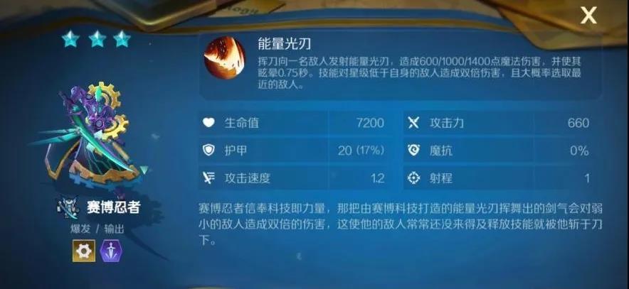 赛博忍者是前期的输出担当,他的技能效果能对星级低于自己的敌人造成双倍伤害,所以前期可以放心大胆升星。铁甲钢拳的面板属性略高于同品质英雄但是技能效果比较一般,拥有中量伤害以及0.75秒的眩晕。