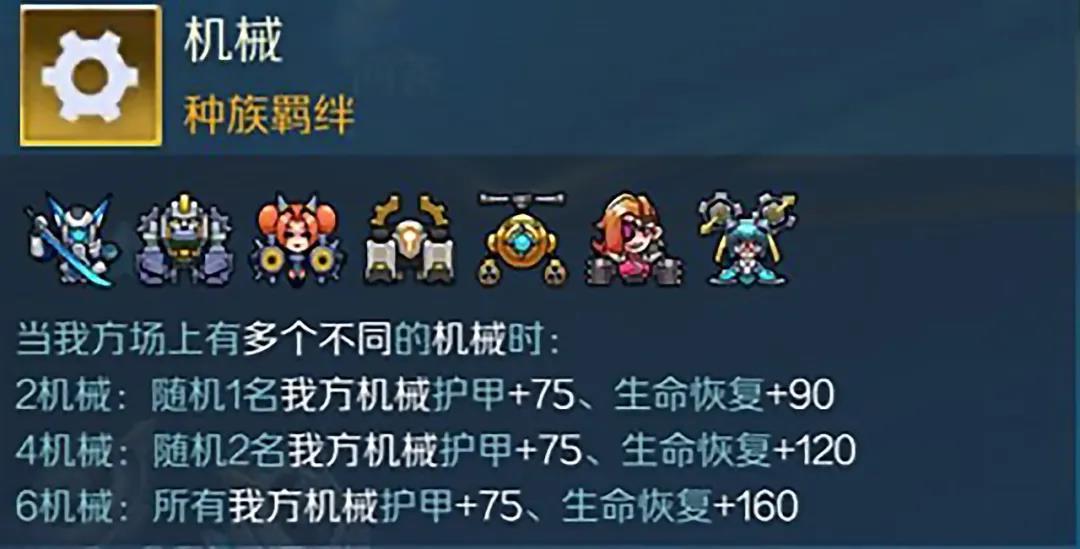 前期机械种族的羁绊并不算强力,但是到达了满羁绊之后,机械种族全员护甲搭配高额的生命恢复,除非遇到了亡灵“破甲”体系,一般情况下很难遇到敌手。