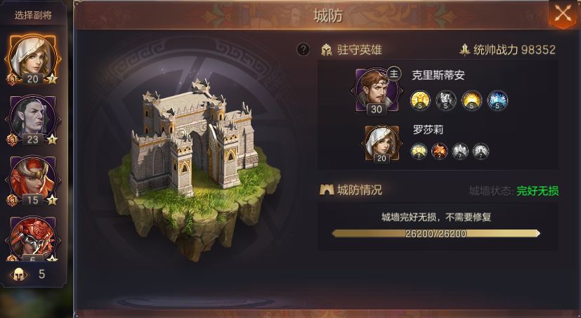 主将和副将要选择适合守城的英雄,比如克里斯蒂安的天赋里有个驻守,罗莎莉天赋里有个辅助,或者看各个英雄的被动技能进行搭配。玩家们可根据自己的喜好选择搭配。这里就不多做介绍了,当然带有驻守天赋的英雄自然更适合守城。