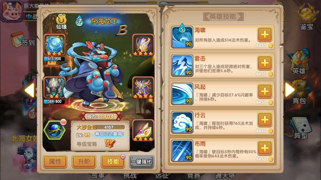 东海龙王:有些跟金吒相似的晕眩流抗压二技能,又有着输出爆表的五技能,兼顾辅助晕眩和输出。而缺点在于抗性低下,面对有弓手的关卡容易被秒。
