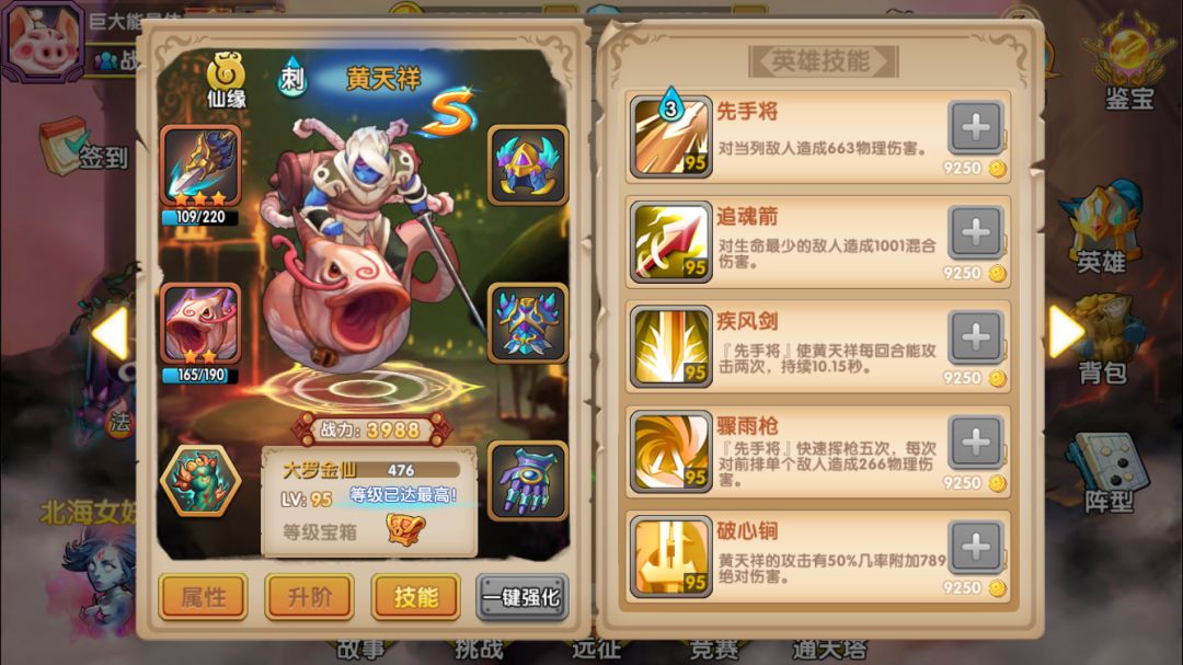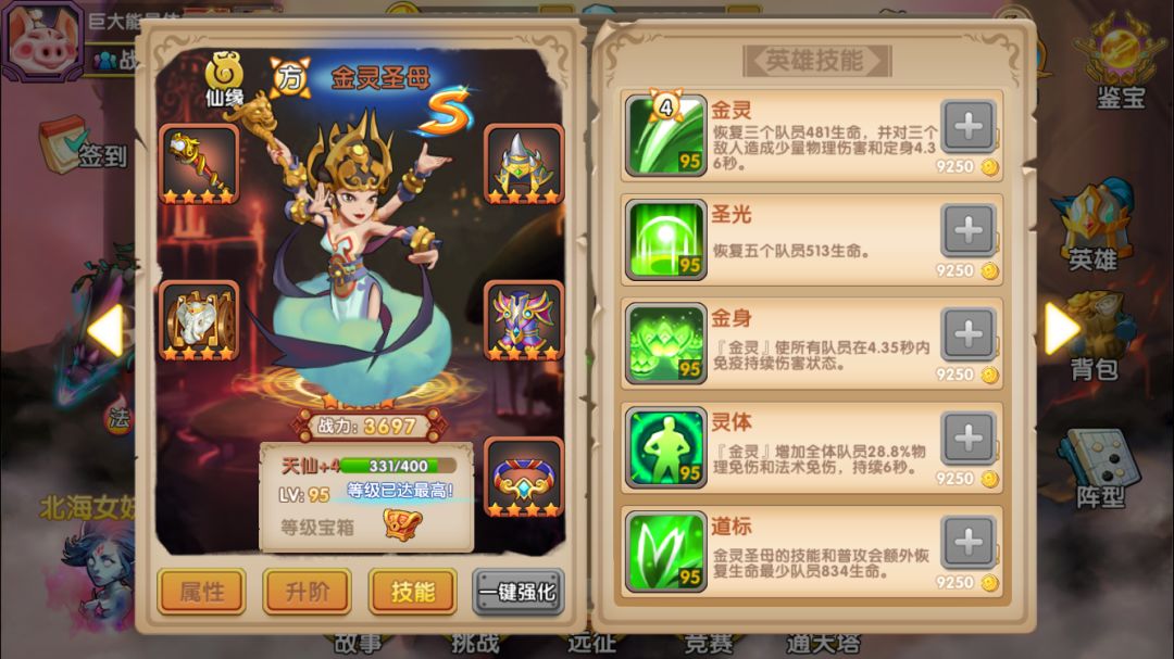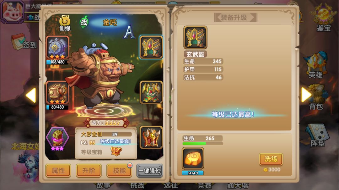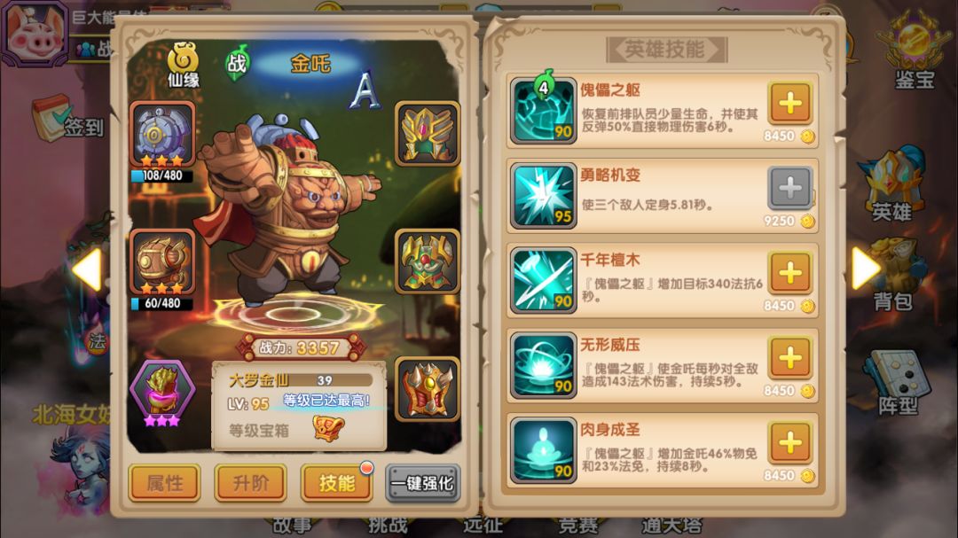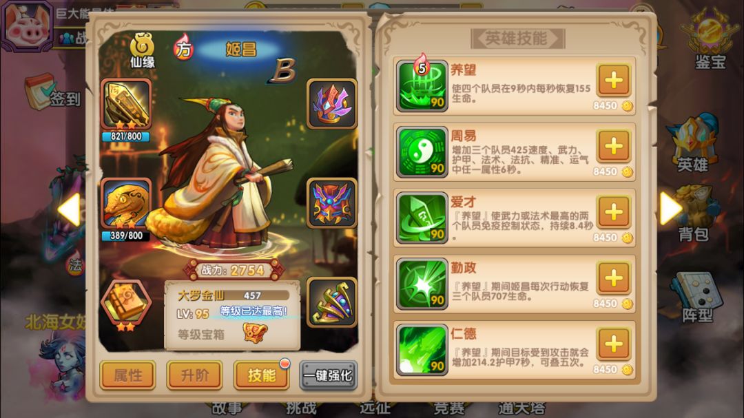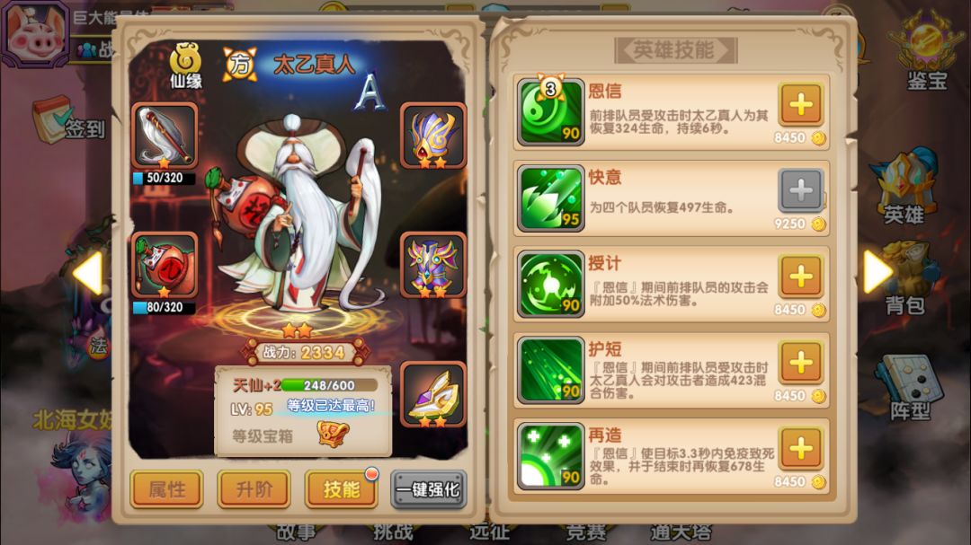 太乙真人:橙太乙3气大招能保护前排不死,二技能被动奶4人,三、四技能的输出对于困难之前的图效果较好。太乙能很好地帮助新手在前期推图,而在渡过前期后,太乙的输出就可以忽略了,但二技能被动奶4人依然非常实用。