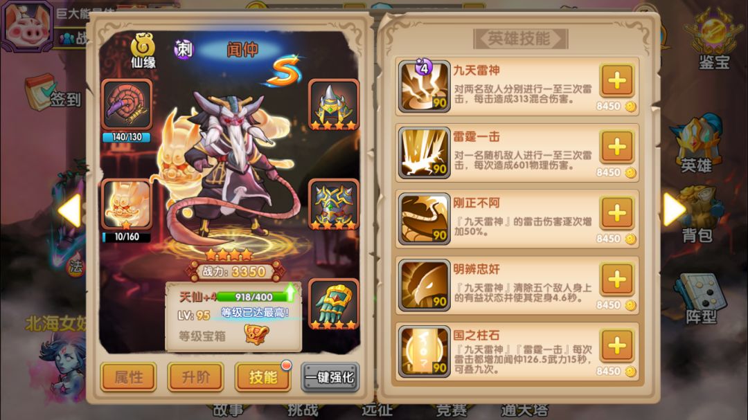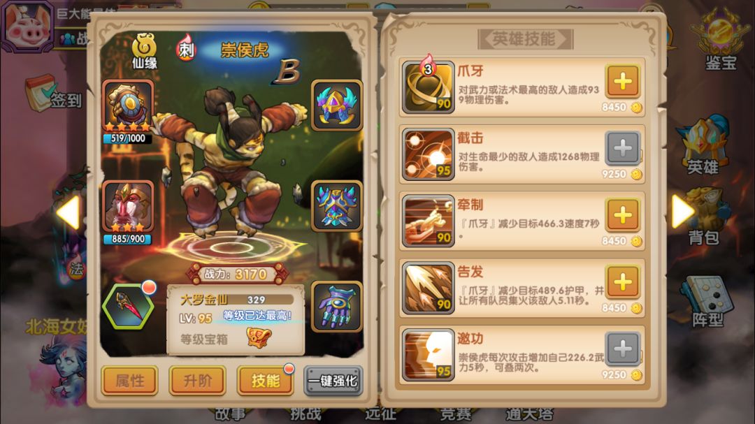 崇侯虎:所有技能都为单点输出设计,还有对付boss非常好用的“集火”功能(关卡里先把boss杀了,其他小怪也就不足为惧),是性价比极高的功能性输出英雄。