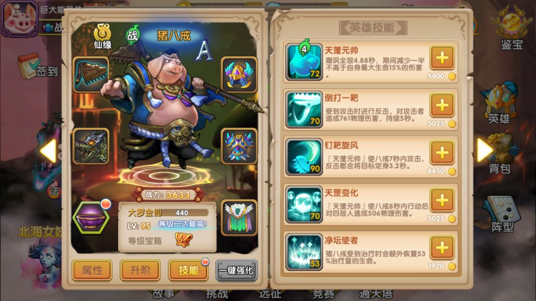 猪八戒:满级金八戒物抗达74%,大招嘲讽全敌+定身,五技能和法宝大大增强续航能力,是非常优秀的控场型坦克。再配合其他输出手,即使在噩梦里也可以走很远,更不用说前中期的关卡。